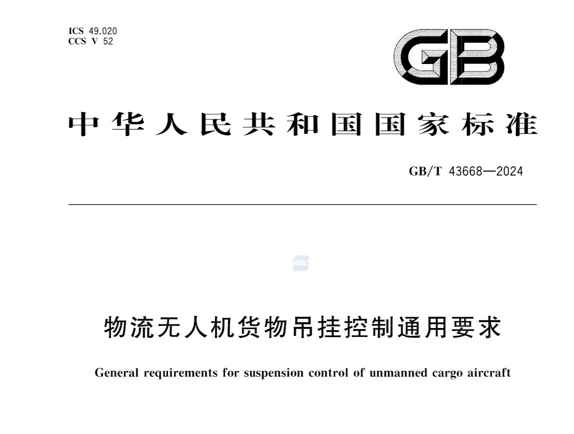 GB/T 43668-2024《物流无人机货物吊挂控制通用要求》规定了物流无人机货物吊挂系统的技术要求、控制功能、安全要求和试验方法。