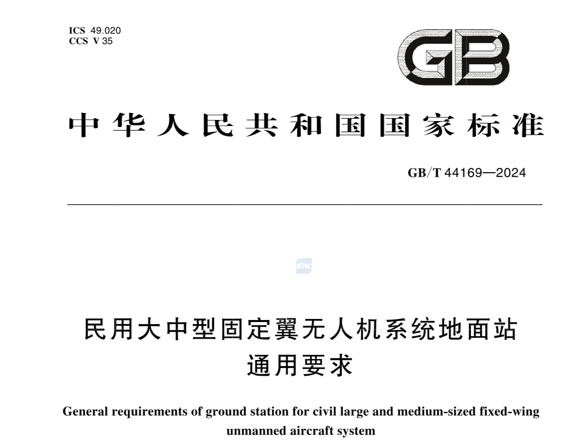 GB/T 44169-2024《民用大中型固定翼无人机系统地面站通用要求》规定了地面站的功能要求、性能要求、人机界面、接口要求和安全要求。