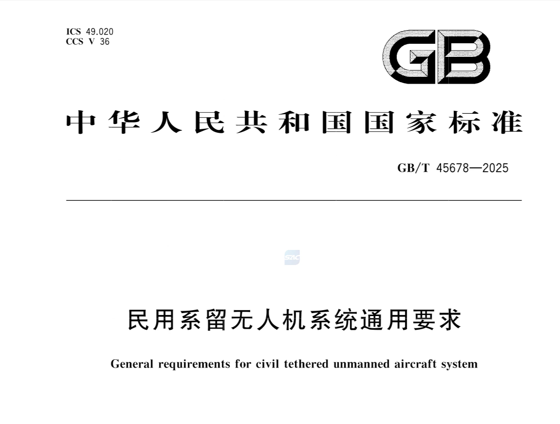 GB/T 45678-2025《民用系留无人机系统通用要求》规定了民用系留无人机的技术要求、系留系统要求、供电系统要求、安全要求和试验方法。