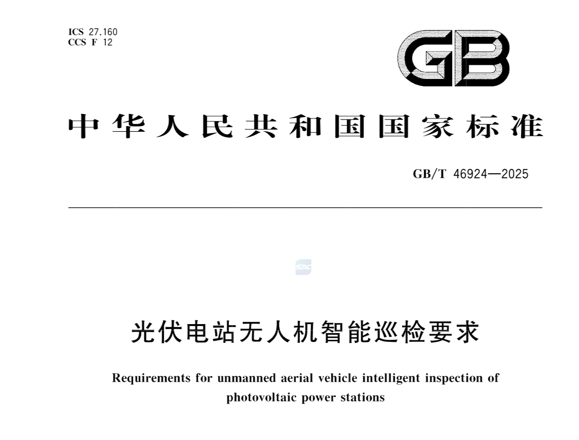 GB/T 46924-2025《光伏电站无人机智能巡检要求》规定了光伏电站无人机巡检的系统功能、作业流程、数据管理和安全要求,适用于光伏电站无人机智能巡检作业。